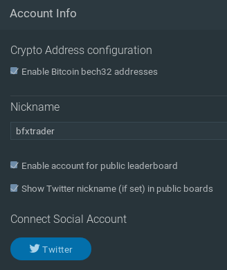 To connect your Bitfinex account with your social account, go to bitfinex.com/account. After you have logged in, expand the “Account Info” section to connect your social account and review your public settings.