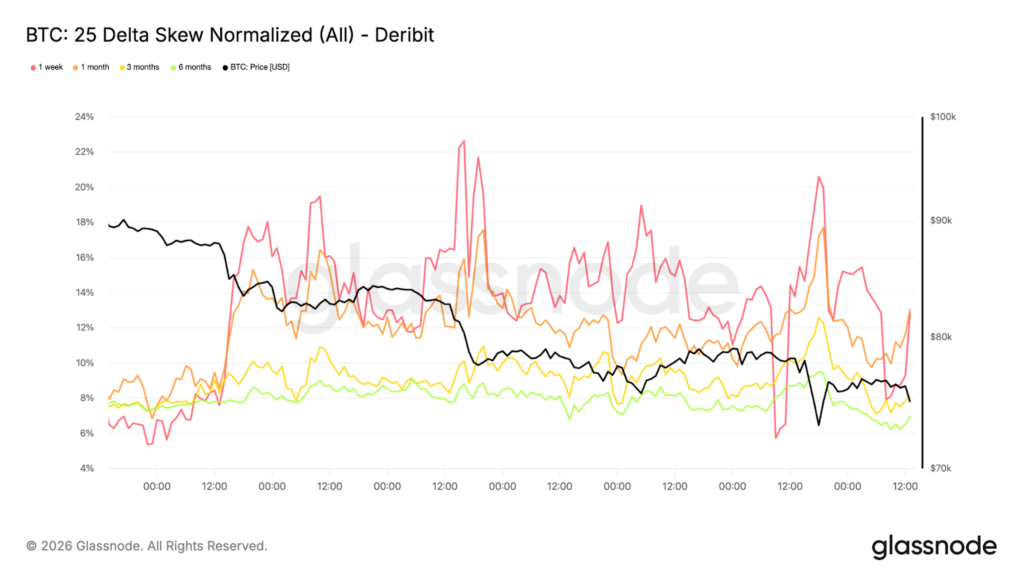 Độ lệch giảm rõ rệt không chỉ đơn thuần là đặc điểm biến động; đó là tín hiệu về sở thích hành vi. Các nhà giao dịch đang thể hiện sự sẵn sàng trả phí bảo hiểm cao hơn thay vì bày tỏ sự lạc quan về hướng đi của thị trường. Cho đến khi nhu cầu mua quyền chọn bắt đầu tăng lên và độ lệch trở lại bình thường, vị thế vẫn mang tính phòng thủ bất đối xứng, với rủi ro được nhận định chủ yếu nằm ở phía giảm chứ không phải trong kịch bản phục hồi bền vững.