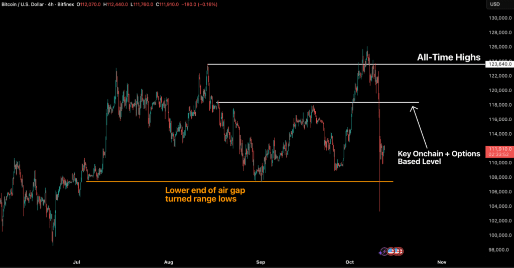比特幣上週從逾 126,000 美元一路下探至短暫跌破 103,310 美元,跌幅達 18.1%,並引發了加密貨幣史上按名目價值計算規模最大的一次強制平倉事件。以太幣自 4,750 美元下跌至 3,500 美元,而多數山寨幣在流動性急凍之下,瞬間暴跌逾 80%。在 10 月 10 日(週五)短短三小時內,市場總值蒸發約 1 兆美元,加密貨幣總市值從 10 月高點 4.26 兆美元暴跌 22.6%,一度跌至 3.3 兆美元。單日爆倉規模超過 190 億美元,遠超過 COVID 崩盤與 FTX 倒閉期間創下的紀錄。