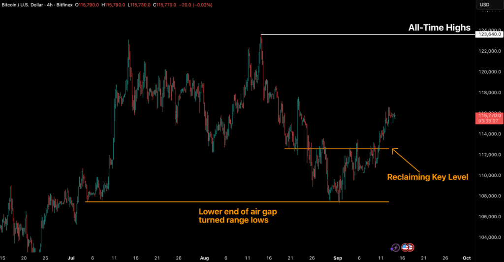 Bitcoin closed the week 4.2 percent higher, breaking a three-week decline and reclaiming the critical $112,500 support level after defending the $107,500 range lows. This rebound from the lower end of the gap marks an important structural recovery, setting the stage for stability into late September and potentially stronger upside momentum in Q4. On-chain data supports this backdrop: the cost-basis distribution heatmap highlights clear dip-buying around $108,000, while supply clusters between $110,000 and $116,000 now define the short-term range. A decisive move above $116,000 would confirm renewed momentum; until then, consolidation remains the base case.