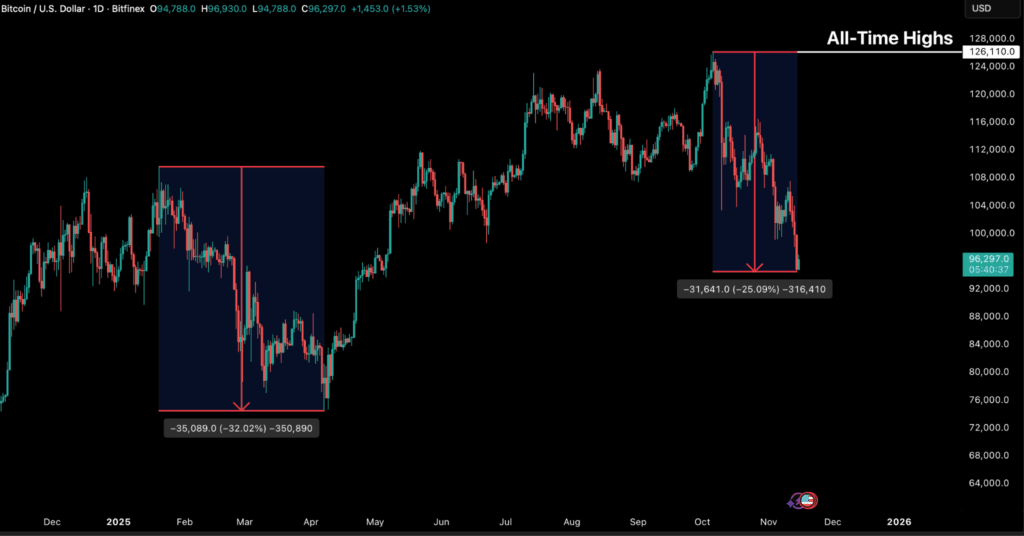 Bitcoin has now logged its third-largest drawdown of the current cycle, falling 25 percent from its all-time high to trade below $94,000 and momentum remains towards the downside on lower timeframes. However, the current pace of selling and the size of realised losses being experienced by investors has begun to stabilise, hinting that the market may be entering a consolidation phase rather than an extended capitulation.