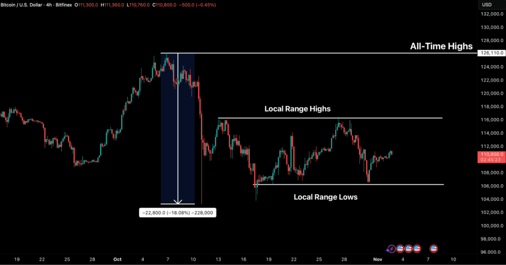 Bitcoin has spent the past two weeks confined within a narrow $106,000–$116,000 range. Despite a brief relief rally to $116,500 last week, BTC remains weighed down by a short-term resistance cluster, that is seeing continued distribution from long-term holders and weak institutional demand. In the options market implied volatility has continued to compress, and investor positioning has shifted to neutral, underscoring a broad lack of directional conviction following the October 10th liquidation event. The cautious tone in risk markets is exacerbated by mixed macro signals from the latest FOMC meeting, and has kept speculative appetite muted and price action subdued.
