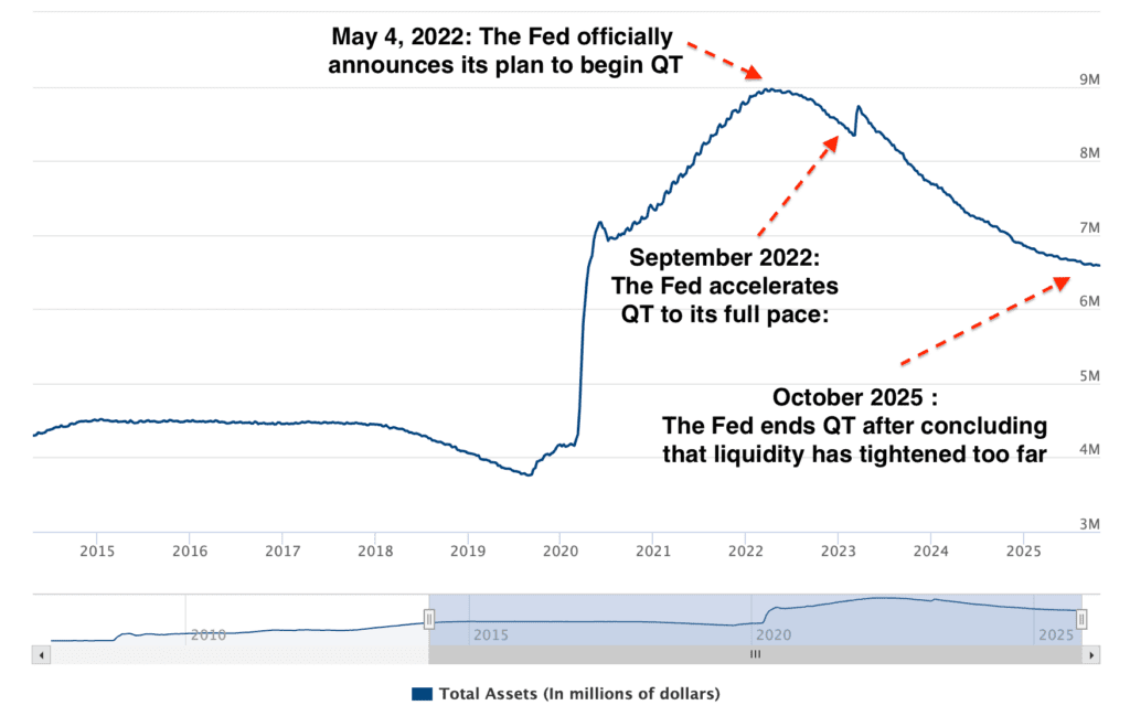 At its meeting on October 30th, the Federal Open Market Committee ended its balance sheet runoff policy and cut interest rates by 25 basis points to a range of 3.75–4 percent. The move responds to tightening liquidity conditions, as money-market funds pull cash from the Fed’s reverse repo facility to buy Treasury bills, draining reserves from the banking system.