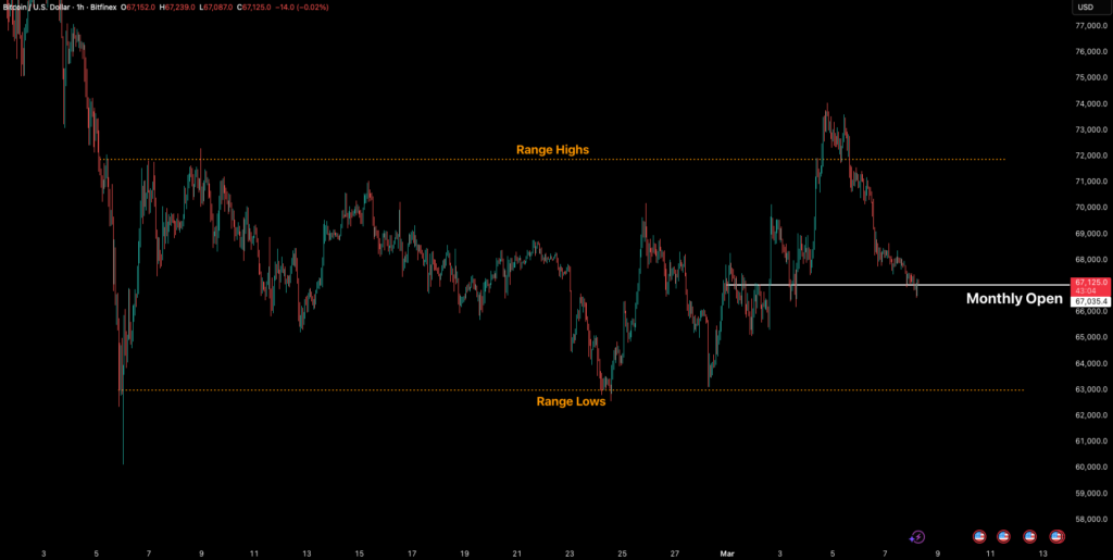 Bitcoin’s early March rally lost momentum with a brief break to $74,047, before reversing and sending price back toward the monthly open near $67,000. The move underscores how firmly the $62,500–$72,000 range continues to define market structure following February’s capitulation.