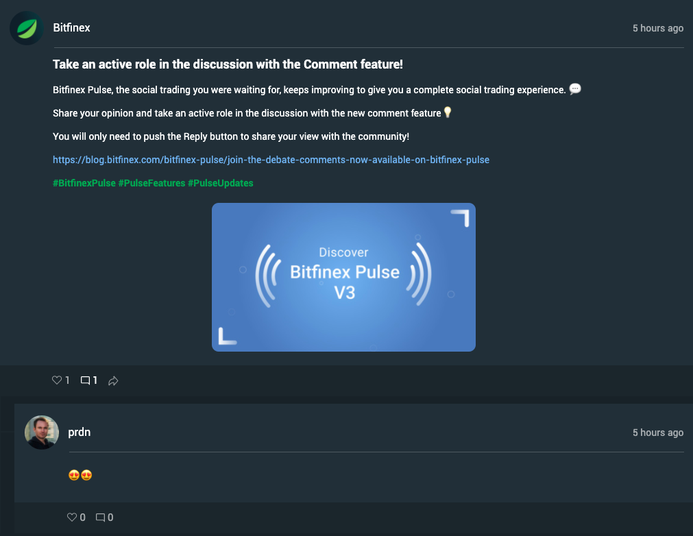 Bitfinex encourages discussions between crypto lovers within the community. So, we added new functionalities on Bitfinex Pulse. With the Bitfinex Pulse v3 upgrade, verified Pulsers can: