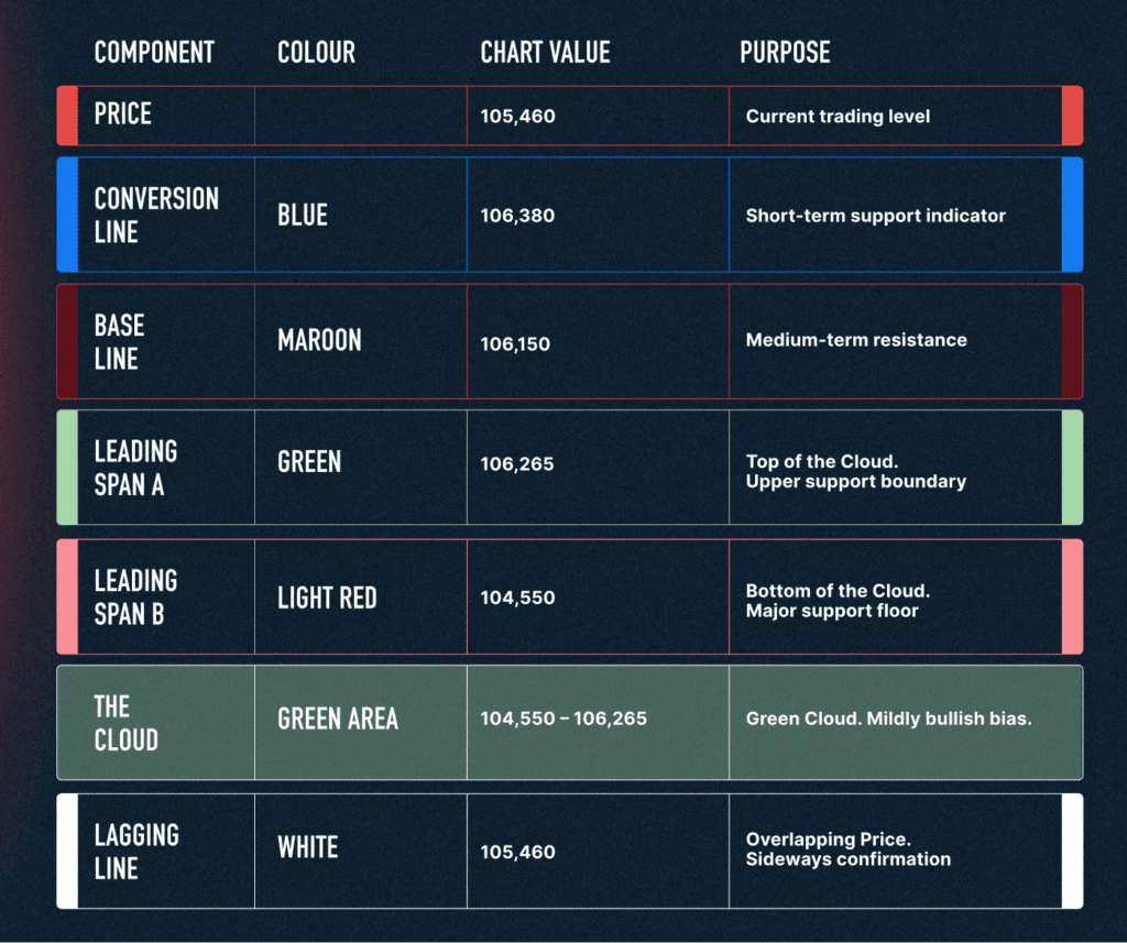 The Cloud projection ahead is red and relatively flat, spanning from 106,360 to 112,578. This 6,218-point range represents the equilibrium zone where buyers and sellers are expected to battle it out over the coming weeks. The flatness of the Cloud is significant as it confirms weak momentum. A thick, angled Cloud would signal strong directional conviction. A flat, horizontal Cloud like this one signals indecision. The market is pausing, not trending.