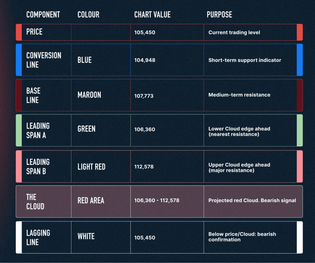 The Conversion Line (104,948) sits below the Base Line (107,773), confirming short-term bearish momentum. The Lagging Line is hovering near current price levels, signalling indecision in the short term. However, since it remains below the Cloud, the broader trend bias is still bearish.