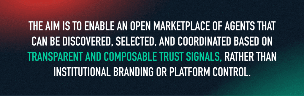 近期提出的 Ethereum 改進提案 ERC-8004,引入了 Ethereum 上「去信任化自主代理(Trustless Agents)」的概念。所謂的去信任化自主代理,指的是能夠自我宣告功能、與使用者或其他代理互動,並在參與者之間無需事先建立信任的前提下執行任務的自主或半自主軟體代理。這些代理並非運行於封閉平台或企業生態系中,而是透過鏈上註冊機制來建立其身份、聲譽與行為可驗證性。此設計旨在打造一個開放的代理市場,使不同來源的代理能根據透明且可組合的信任訊號被發現、選擇與協調,而不必依賴機構品牌或平台控制。如此一來,由不同開發者或組織所創建的代理,皆能在同一網絡中互相運作,同時維持可驗證的安全保證。
