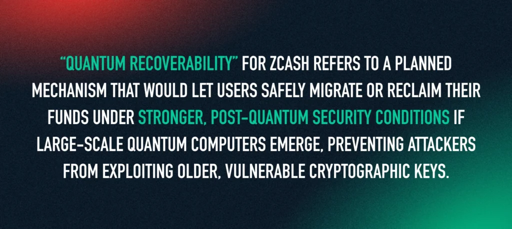 Developers are also working on what they describe as “quantum recoverability” for Zcash funds, particularly within the Orchard shielded pool. “Quantum recoverability” for Zcash refers to a planned mechanism that would let users safely migrate or reclaim their funds under stronger, post-quantum security conditions if large-scale quantum computers emerge, preventing attackers from exploiting older, vulnerable cryptographic keys. The idea is to give users a way to migrate or “rescue” their assets if credible quantum threats emerge sooner than expected, without handing an advantage to attackers. This involves changing how wallets manage keys and how spending conditions are expressed, so that if the community needs to tighten security, by switching to post-quantum conditions or additional checks, honest users can move their funds safely while quantum adversaries cannot easily front-run them. In parallel, the team is considering a dedicated long-term storage mechanism for users holding large balances or very long-horizon savings, allowing them to opt into stronger, more conservative cryptographic protections before quantum hardware matures.
