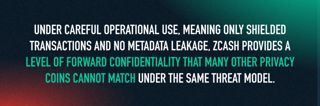 Compared with other privacy-focused chains, Zcash also holds a distinct position. Monero, for example, uses ring signatures, stealth addresses, and RingCT to obscure transaction flows, but these mechanisms still depend on elliptic-curve cryptography that quantum computers are expected to break. Once elliptic curve cryptography becomes vulnerable, Monero’s anonymity set can be unwound retroactively because ring members and stealth address derivations ultimately rely on discrete-log hardness. That being said, Monero, like Zcash, has a development community already discussing and planning solutions for potential quantum vulnerabilities.  Zcash’s shielded pool, by contrast, hides far more information by default. Under careful operational use, meaning only shielded transactions and no metadata leakage, Zcash provides a level of forward confidentiality that many other privacy coins cannot match under the same threat model.
