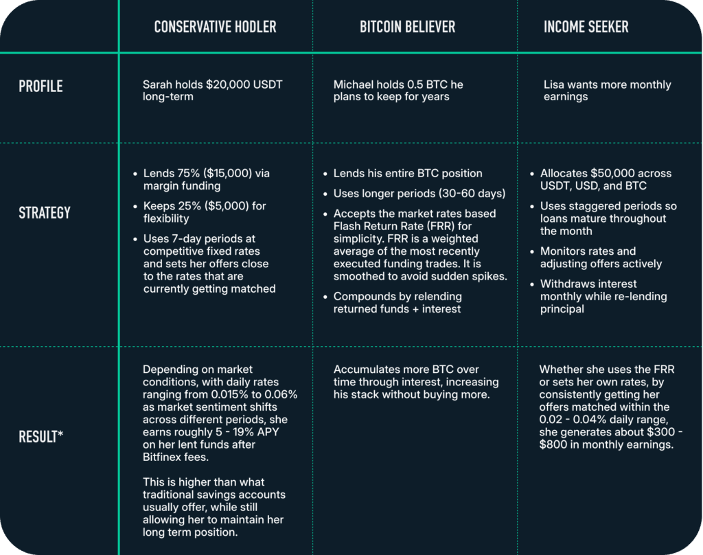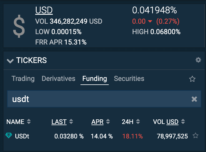 You should not construe the information provided in this post as financial, legal or other advice. The information provided in this post is not an offer to borrow or lend. It is also not the solicitation, recommendation or endorsement of any course of transacting. The information provided in this post is for information and illustrative purposes only. Any references to earnings, interest rates or other results are hypothetical and not guaranteed. Actual earnings, interest rates or other results may differ. Bitfinex makes no guarantees regarding the amount of earnings, interest rates or other results. The peer to peer lending market on the Site is available only pursuant to the Terms of Service.