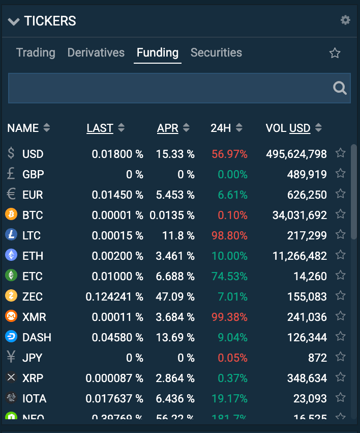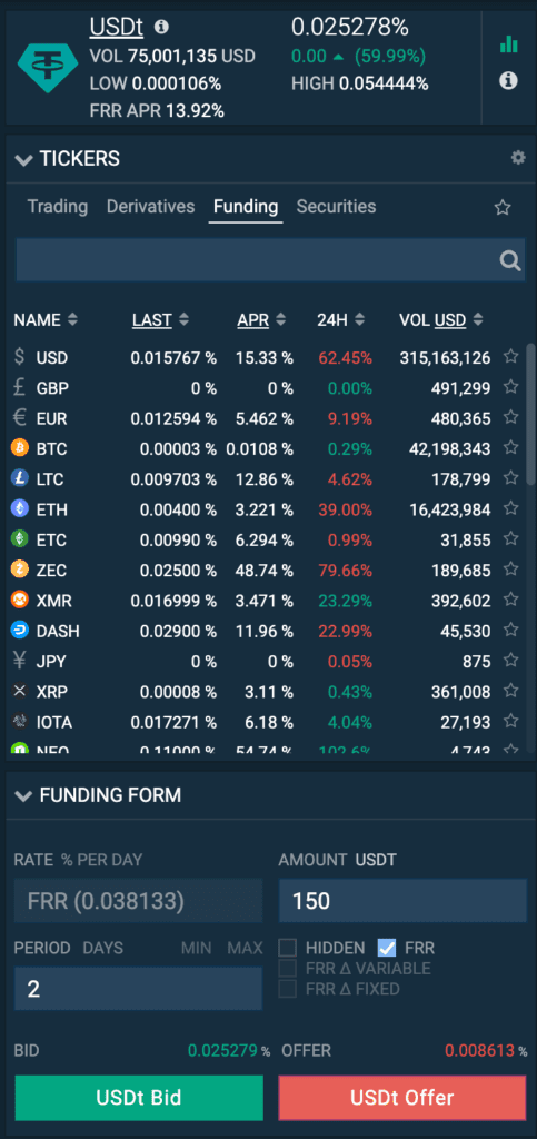6. Diverse Currency Options: Bitfinex supports margin funding in multiple currencies, not just Bitcoin or Ethereum, but also stablecoins like USDT (this is actually the most popular currency for lending in Bitfinex’s peer-to-peer lending marketplace) and many others, giving you options based on your risk tolerance and portfolio composition.