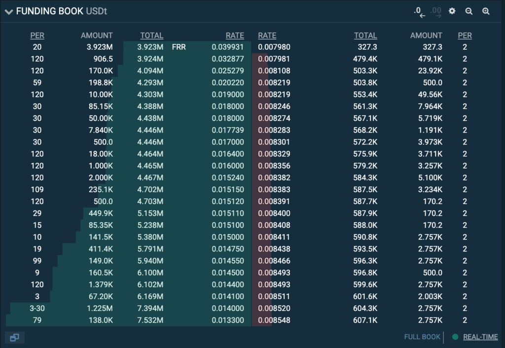 If you lend your cryptocurrency at a fixed rate and market rates spike dramatically, you’re locked into your original rate until the loan period expires or is repaid. This is simply the nature of fixed term lending. That said, Bitfinex’s funding market offers both fixed and flexible rate options, which can adjust more quickly to changing market conditions. It also allows for shorter loan periods (2-7 days) so you can stay nimble. Once a short-term loan expires, you can update your fixed rate to match the latest market conditions. This is why many lenders tend to prefer shorter durations: they get to refresh their offers more often and stay aligned with where the market is heading.