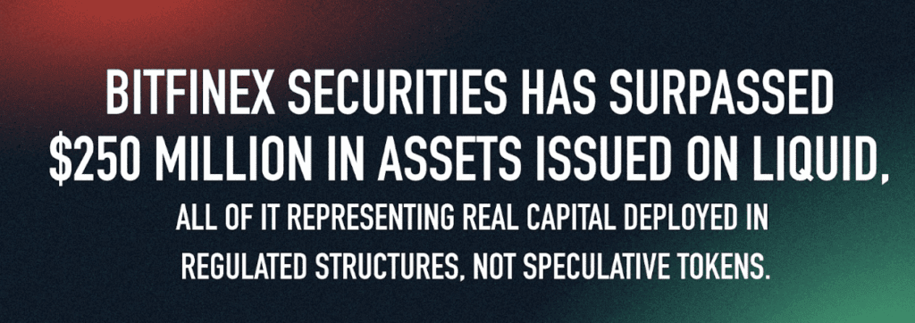 Across these offerings, Bitfinex Securities has surpassed $250 million in assets issued on Liquid, all of it representing real capital deployed in regulated structures, not speculative tokens.