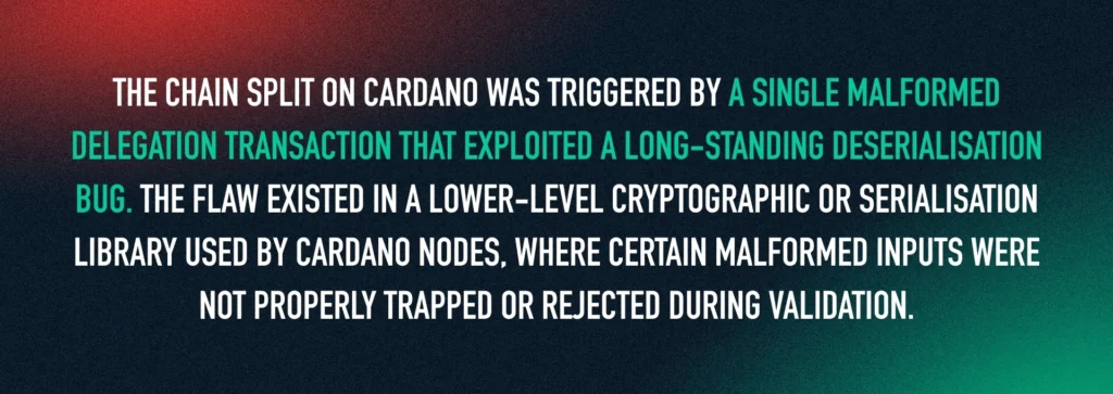 The chain split on Cardano was triggered by a single malformed delegation transaction that exploited a long-standing deserialisation bug. The flaw existed in a lower-level cryptographic or serialisation library used by Cardano nodes, where certain malformed inputs were not properly trapped or rejected during validation. When the crafted transaction was broadcast, newer node versions mistakenly accepted it as valid, while older node versions correctly flagged it as invalid. Because both groups of nodes continued producing blocks according to their own interpretation of the ledger, the network diverged into two separate chains, one containing the malformed transaction (“poisoned”) and one without it (“healthy”).