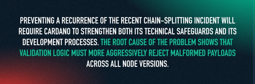 Preventing a recurrence of the recent chain-splitting incident will require Cardano to strengthen both its technical safeguards and its development processes. The root cause of the problem shows that validation logic must more aggressively reject malformed payloads across all node versions. Future upgrades will need to include stricter, uniform validation rules implemented at multiple layers of the stack, ensuring that older and newer nodes cannot disagree on whether a transaction is valid. This implies broader use of invariant checks, fuzz-testing against malformed inputs, and formal verification for critical serialisation and ledger-rule components so that inconsistencies are identified before deployment rather than during live operation.