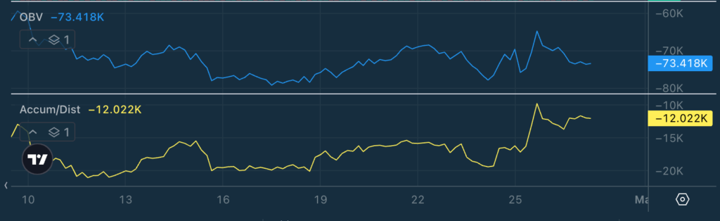 - OBV: -39,068 – falling steadily since late January, steep decline