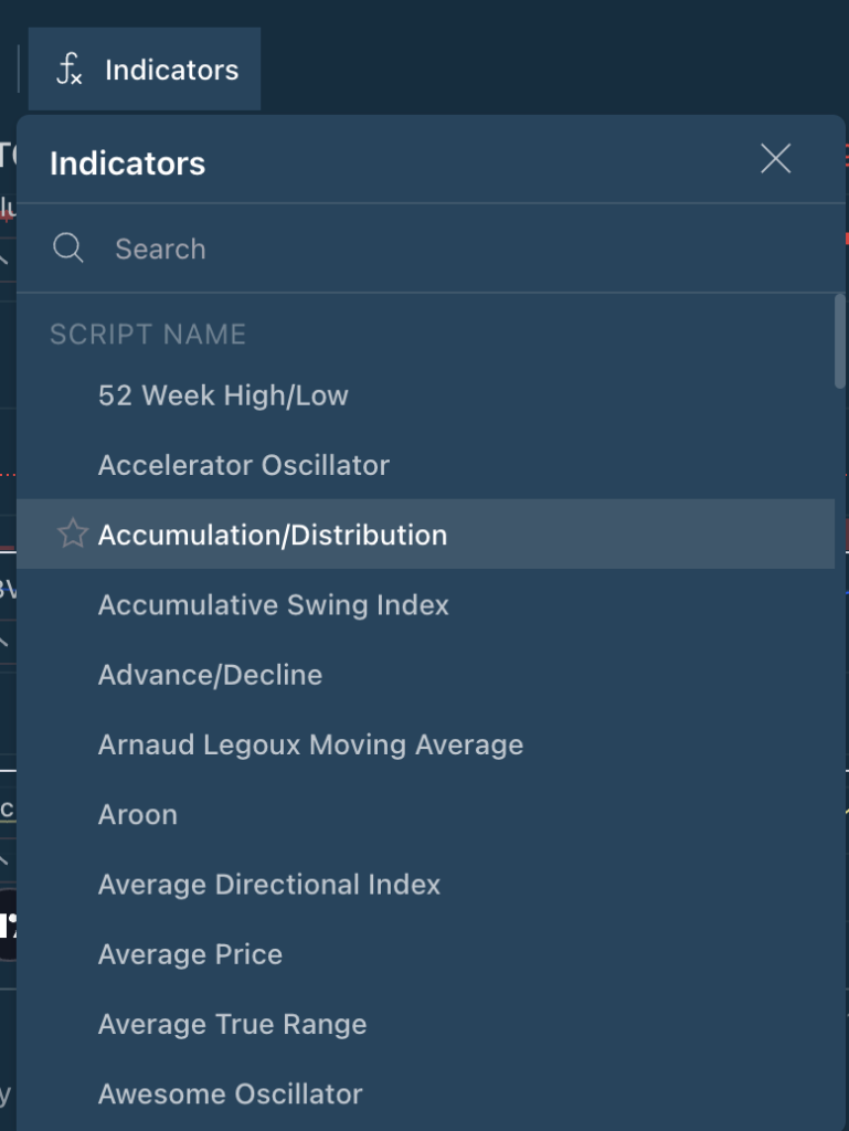 - Add “Accumulation/Distribution” from the indicators menu