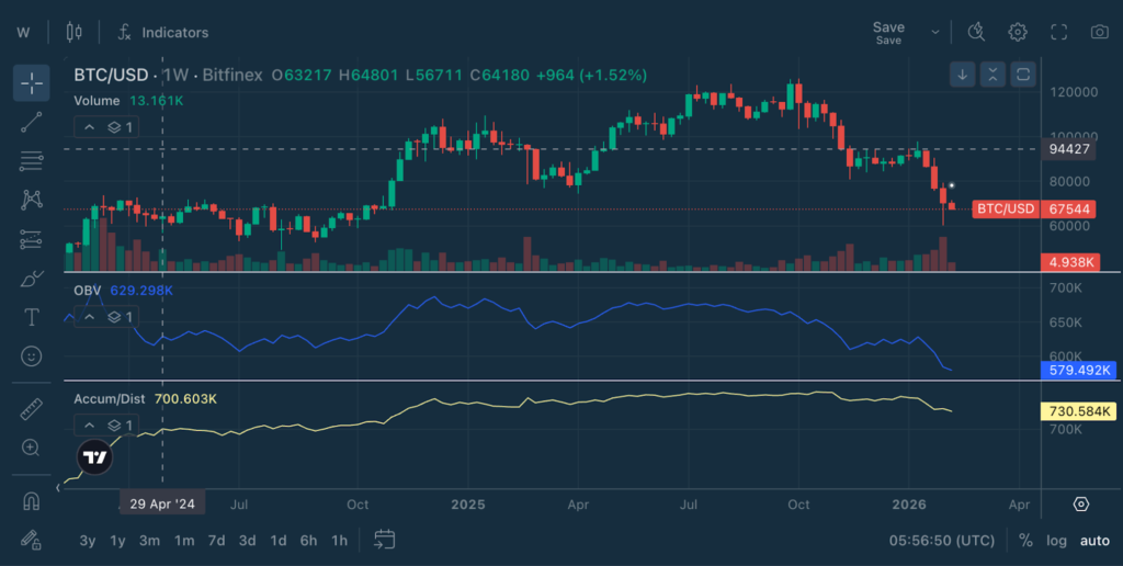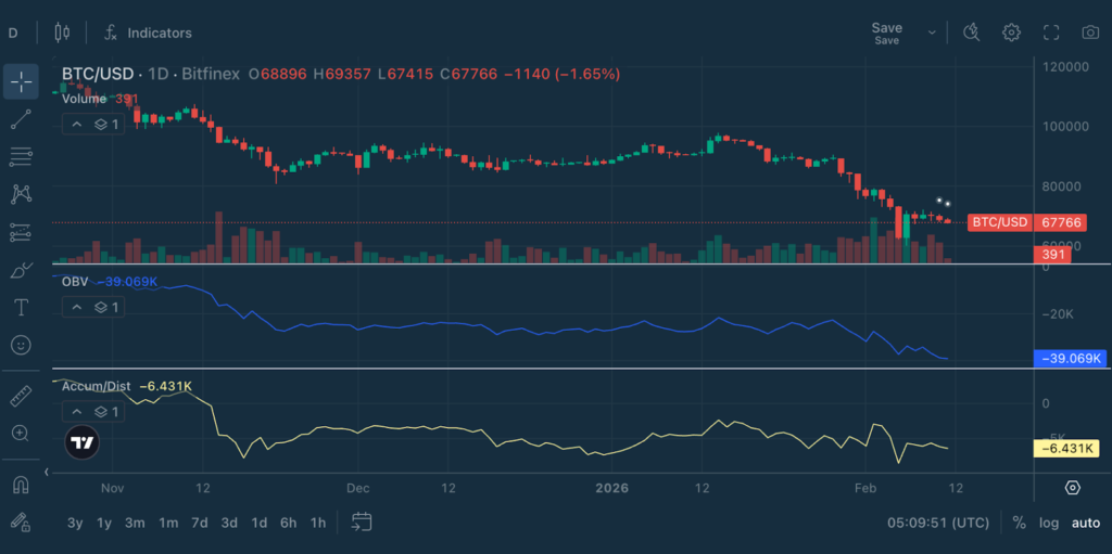 Let’s look at BTC/USD daily chart on Feb 11, 2026 with A/D and OBV loaded: